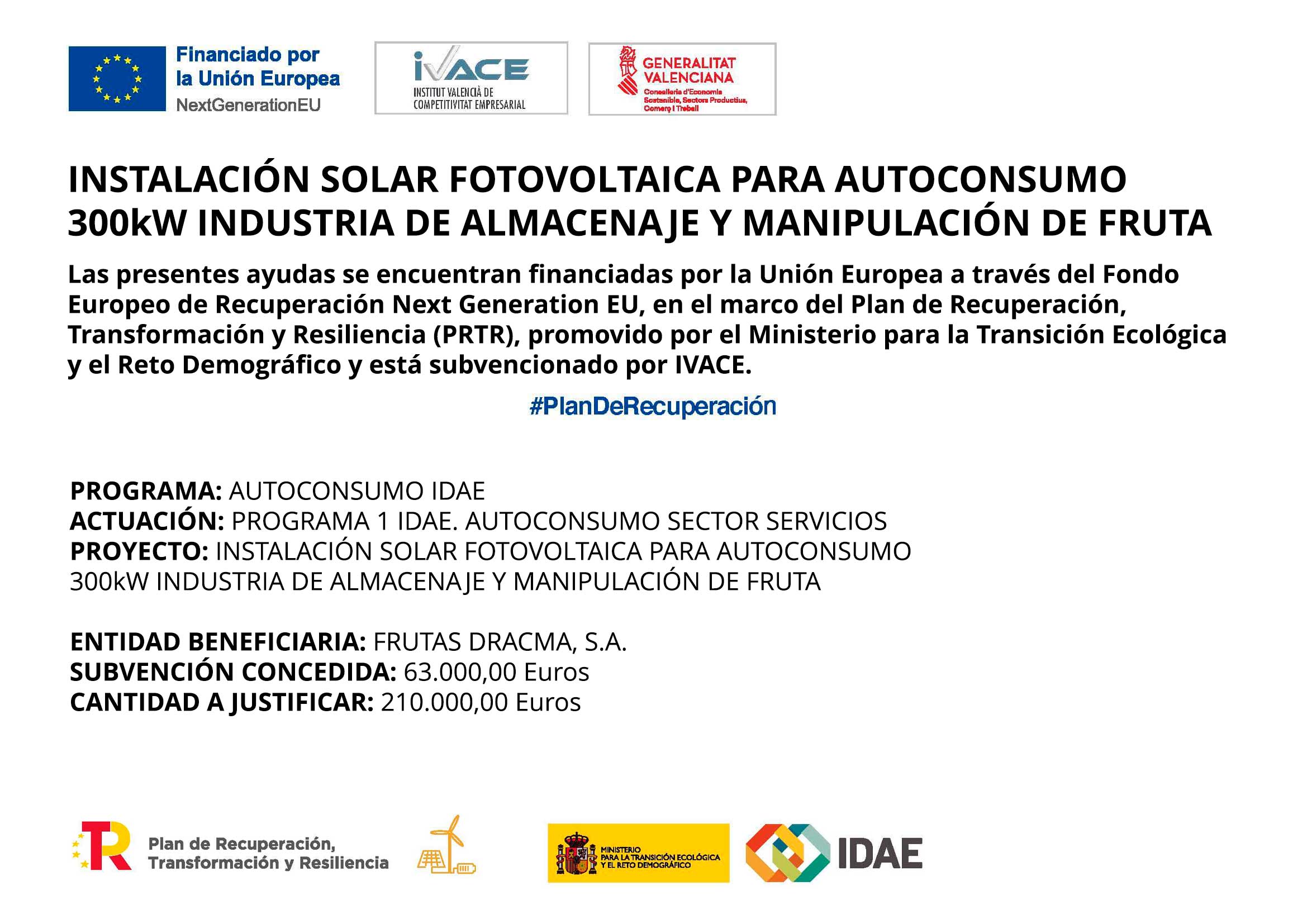 Frutas Dracma, con el apoyo del Plan de Recuperación, Transformación y Resiliencia, financiado por la Unión Europea – NextGeneration EU, ha finalizado la implantación de una instalación fotovoltaica de autoconsumo en sus instalaciones situadas en Camino Moncofa, s/n, en Xilxes.